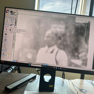 Also amongst my belongings that day were the Gladden film negatives I shared in last week’s blog. I had hoped to digitize the images stored on it during my busy day on campus. After the RICHES meeting concluded, I worked on the Gladden Digital Archive while waiting for Geoffrey Cravero for our appointment at the CHDR lab. We soon discovered that the microfilm scanner housed by CHDR was quite difficult to operate, especially since the film negatives are not attached to a reel. Geoffrey and I learned from the CHDR team that this particular scanner had not been used in three years! Although we couldn't digitize the Gladden negatives, Geoffrey and I gained partial insight into the contents of these intriguing images. In the attached photos, you will find an image of the scanner (a ScanPro3500), a brief view of Joseph Cauley, and most excitingly, what seems to be Michael Gladden Jr. standing outside his storefront. Geoffrey plans to meet with Mike from the CHDR team to learn how to use the software associated with the microfilm scanner before next week. Hopefully, we can set our sights on another scanning session soon!